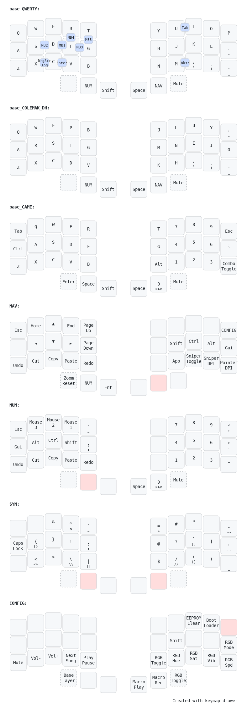 - Add new lines so multi line layer defines will work - Changed TR_MINS to KC_MINS on number layer for F12 override - Added more overrides for print screen and file explorer - Added grave and semicolon back to number layer - Moved media keys to config layer