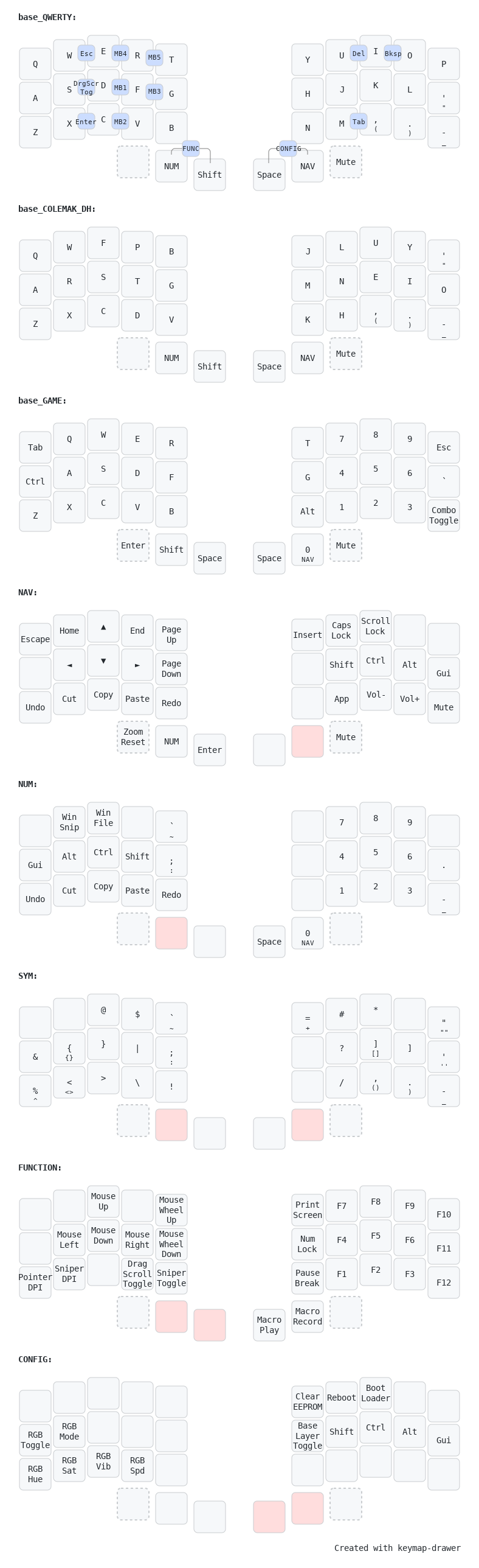 The custom layout optimizes for programming (SQL, Powershell, C) and minimizes holds for comfort. It started from Manna Harbor Miryoku and took heavy influence from Jonas Hietala T-34. The keymap designed for split 3x5, two thumbs keys, dual encoders, and combined with a Ploopy Nano trackball mouse. Design themes: