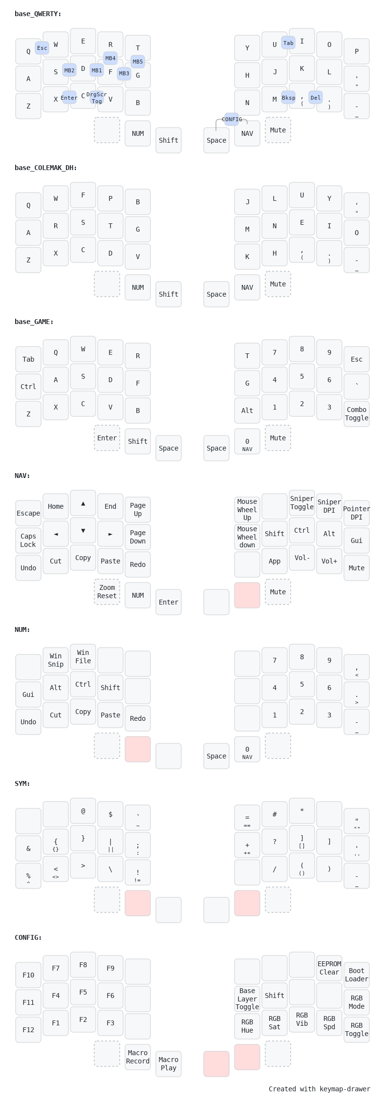 This layout is designed to be used with a Ploopy Nano. Mouse buttons and scroll wheel is handled on the keyboard side. There are macros with the host status (Caps lock, Num Lock) to toggle Ploopy Nano settings or change the tracking to simulate a scroll wheel