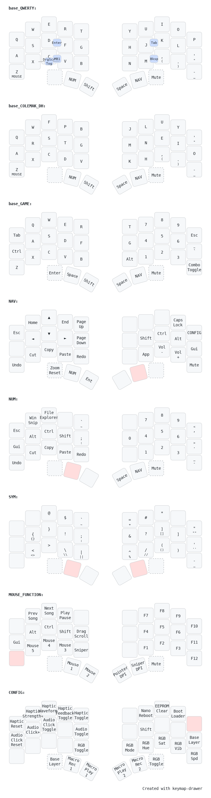 - Brought back Mouse Z for temporary mouse usage - Combined Mouse and Function Keys into one Layer - Cleaned up unused code (e.g. combos, key overrides) - Updated all keyboards with new layer - Updated documentation - I think this will be it for now. Making a list somewhere else for future enhancements